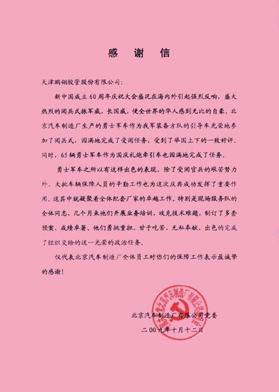 2009年10月20日,我公司收到北京汽车制造厂有限公司发来的感谢信一封,信中就8868体育官网登录入口在国庆阅兵式所用的勇士军车的整个配套保障过程中,所作出的贡献表示感谢!